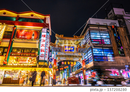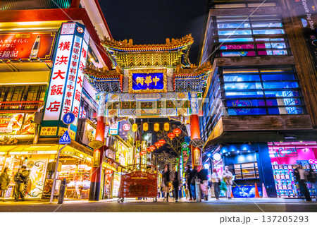日本の横浜都市景観 2025春節燈花。夜の善隣門や中華街大通り、龍などを望む…新時代へ