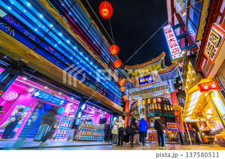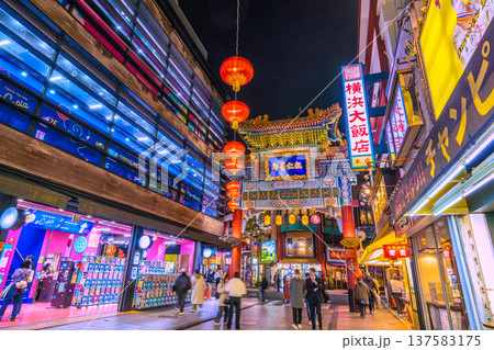 神奈川県横浜市 活気あふれる横浜中華街の街並みと天長門