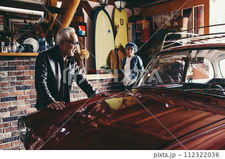 ガレージ前で愛車と佇むシニア夫婦のファッション写真