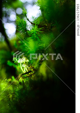 光差す森の中の小さなキノコ