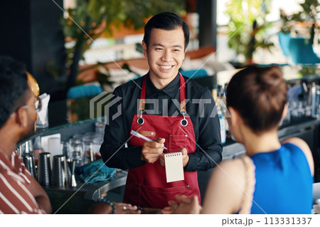Smiling waiter talking to couple, recommending drinks and dishes of the day