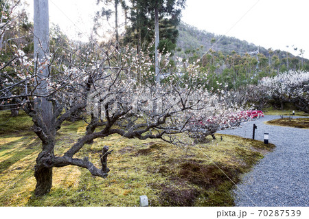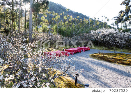 京都の梅の名所「しょうざんリゾート」日本庭園、白梅が満開の梅園