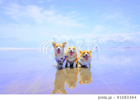 美しい波打ち際を散歩するコーギー
