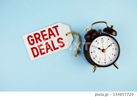 Great Deals text on price tag with alarm clock on blue background