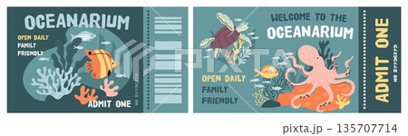 Oceanarium tickets templates. Aquarium museum with exotic fish, corals and marine underwater animals, access passes funny design, sea life coupons or flyer, garish vector cartoon set