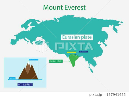 illustration of physics and geography, Mount Everest, Everest is formed by the collision of two tectonic plates, Mount Everest is the highest mountain in the world