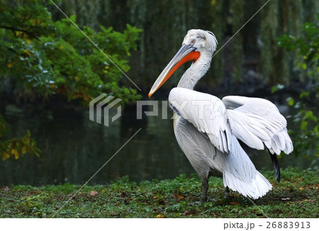 Dalmatian pelican with open wing on the lake