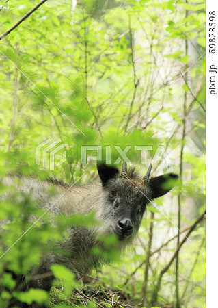 目が合う野生のニホンカモシカ、宮城県気仙沼市
