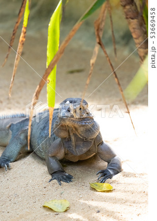 Exotic Rhinoceros iguana is resting on sand in tropical garden.