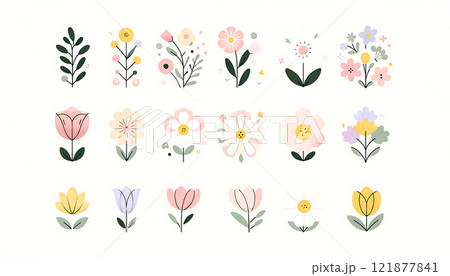 カラフルなシンプルフラワーデザインセット - 春の花のイラストコレクション AI生成