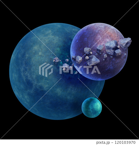3D space planet concept, alien sci-fi realistic satellite asteroid illustration rock debris render.