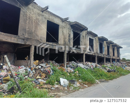 Desolate, abandoned landscape filled with ominous smoke wafting over the ruins should be seen