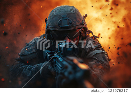 Soldier engaged in battle with modern combat gear in intense action during military operation