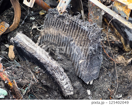Burned heater core from a car showing severe fire damage, melted fins, and exposed internal structure lying among charred debris and wiring remnants
