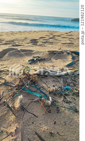 Garbage, plastic, and wastes on the beach of Portugal. Sand beaches polluted with pieces of plastic, cigarette pack
