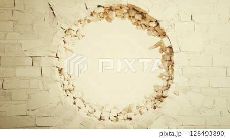 Circular hole in white brick wall, architectural concept, minimal destruction