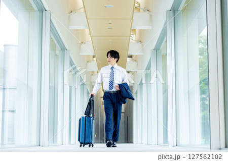 キャリーバッグを持って歩く若い男性