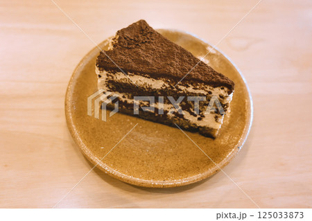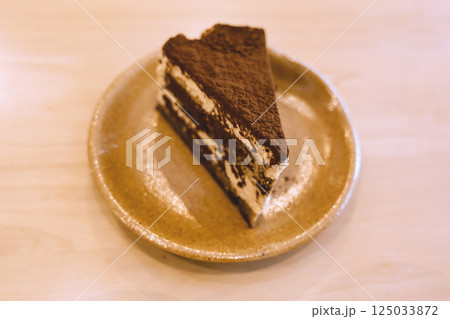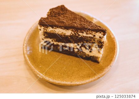 Slice of delicious tiramisu cake on ceramic plate served on wooden table in warm cozy cafe atmosphere