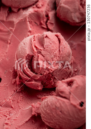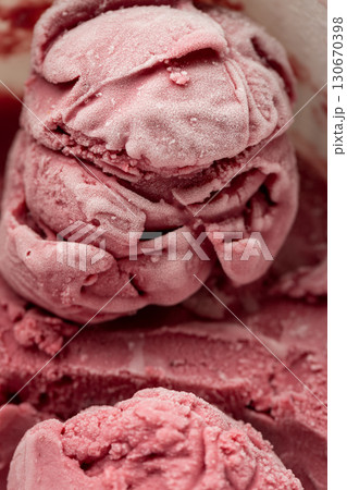 Close-up of pink berry sorbet scoops with frosty texture in natural light