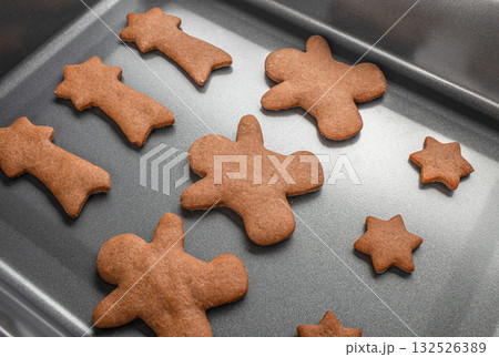 Freshly baked gingerbread cookies in various shapes on a baking tray, close up