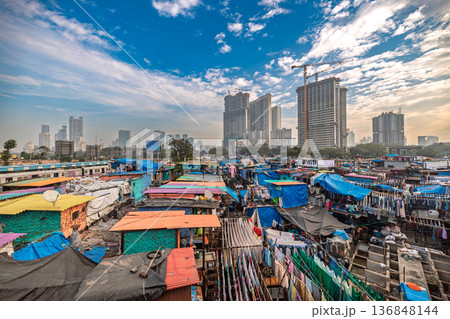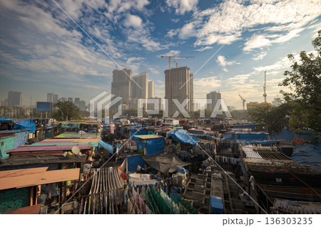 Mumbai, India. View On Dhobi Ghat And Modern Skyscrapers. Dhobi Ghat Is Open Air Laundry. One Of Largest Outdoor Laundry. Popular Attraction Among Foreign Tourists. Class Differences Between People