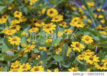Field of Melampodium plant yellow flower and green leaves blooming at the garden.
