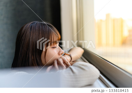 窓辺で物思いにふける若い女性の横顔