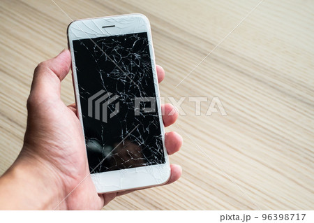 Close up Hand hold mobile phone with broken glass