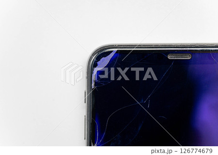 The upper part of the broken smartphone with cracks on the glass of the screen close-up on a white background.