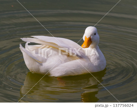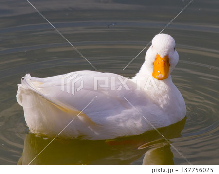 Cute white duck floating on calm water(静かな水面に浮かぶ白い