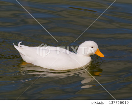 White domestic duck swimming on pond water(池を泳ぐ白いア