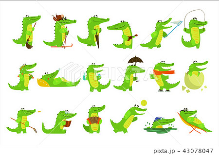 Humanized Crocodile Character Every Day Activities Set Of Illustrations