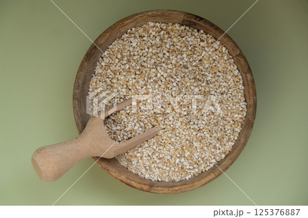 Fine ground barley in green background copy space Whole spelt grain species. High protein fiber-rich vegan plant based food ingredient. Gluten free superfood healthy nutritional dietary alternative