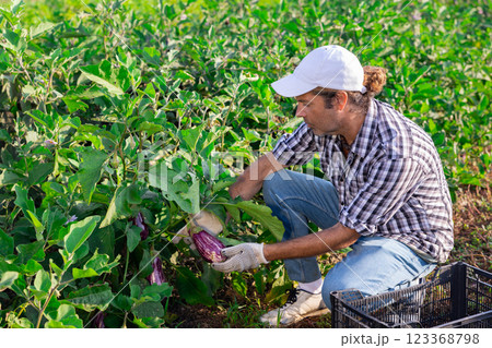Hardworking man sorts ripe recently harvested eggplants in a warehouse