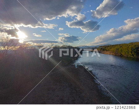 川と橋、太陽が照らす緑の風景