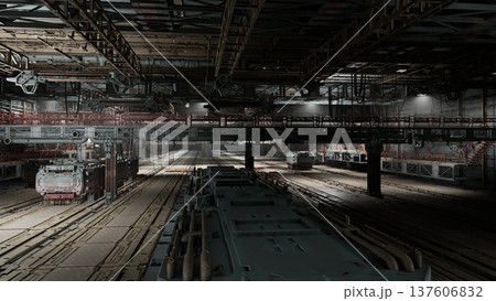 Pale dawn light across transit depot with trains, preparation lanes and overhead gantries, technicians prepping carriages offframe, subtle warm glow on steel,