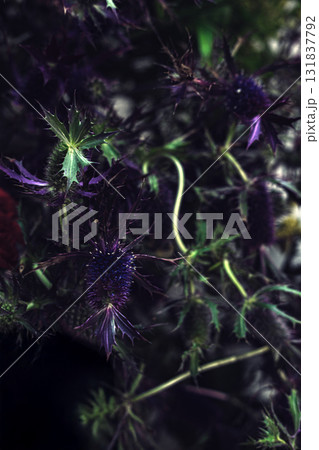 Close-up of Eryngium planum blue thistle with jagged leaves and deep purple spiky blooms in soft dramatic light. Eryngium floristry, wild texture aesthetic, moody botanicals, late summer florals