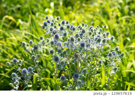 Eryngium planum or Blue Sea Holly in garden. Wild herb plants, thorny healing weeds.