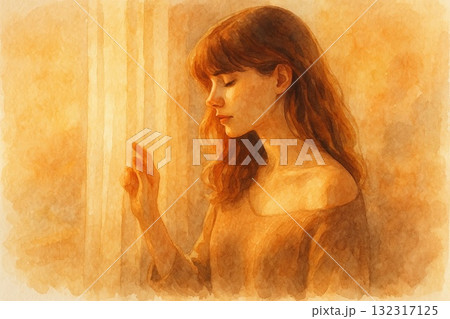 夕暮れの光に包まれる女性の静かな横顔