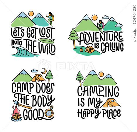 Camping Set. Backpacking and Hiking cartoon doodle illustrations on white background. Tourists equipment for Trekking