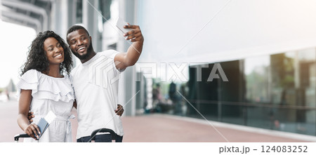A happy black couple is taking a selfie at an airport departure area. The woman is smiling and looking at the camera while the man is holding the phone, copy space