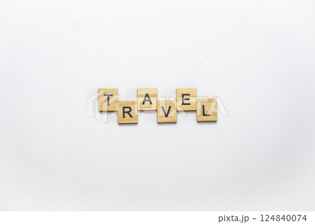 Wooden letter tiles spell out the word 'TRAVEL' on a white background, ideal for travel-themed designs