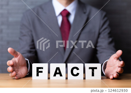 FACTのブロックとスーツを着たミドル男性ビジネスマン