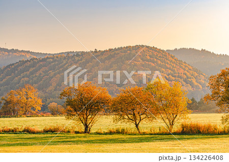Autumn forest line glowing with golden trees in a quiet meadow at golden hour