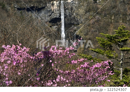 奥日光明智平展望台付近に咲くアカヤシオツツジの花と華厳の滝
