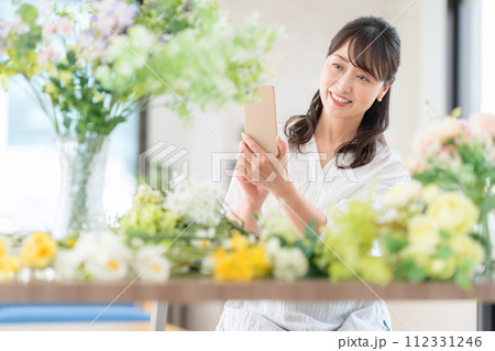 リビングで趣味のフラワーアレンジメントをスマホで撮影するミドルの女性