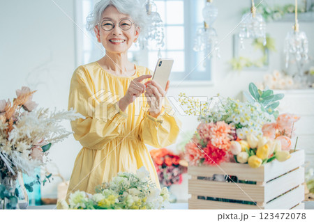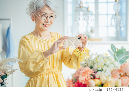 リビングで趣味のフラワーアレンジメントをスマホで撮影するミドルの女性