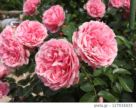 Varietal elite roses bloom in Rosengarten Volksgarten in Vienna. Pink Floribunda rose flowers