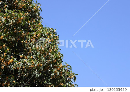 快晴の青空と鮮やかなオレンジ色の金木犀