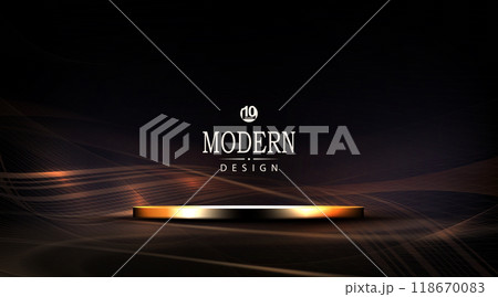 Composition with a shiny podium and a round frame in gold tones with wavy ribbons